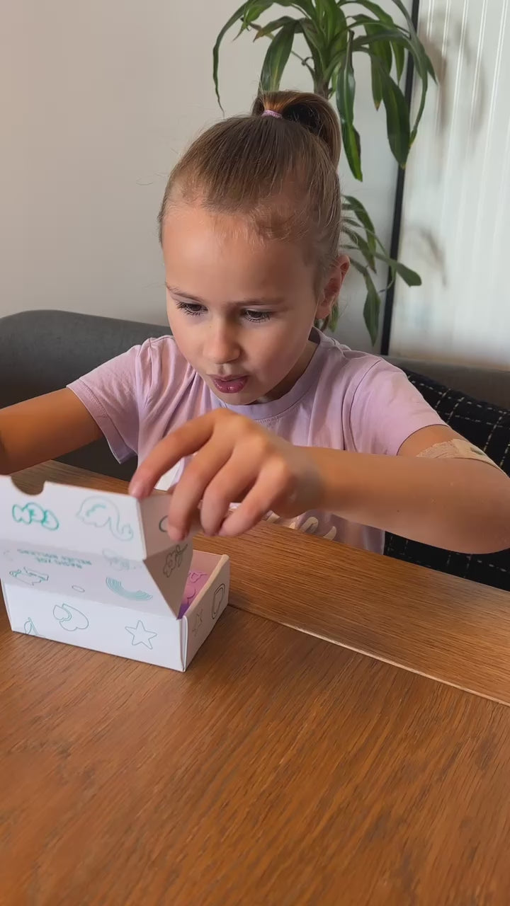 Deze set ontstond samen met Zoë, die houdt van mooie vormen en fantasierijke figuren. Haar tekeningen van een zwaan, vlinders, sterren en een poes vormden de inspiratie voor de ontwerpen.